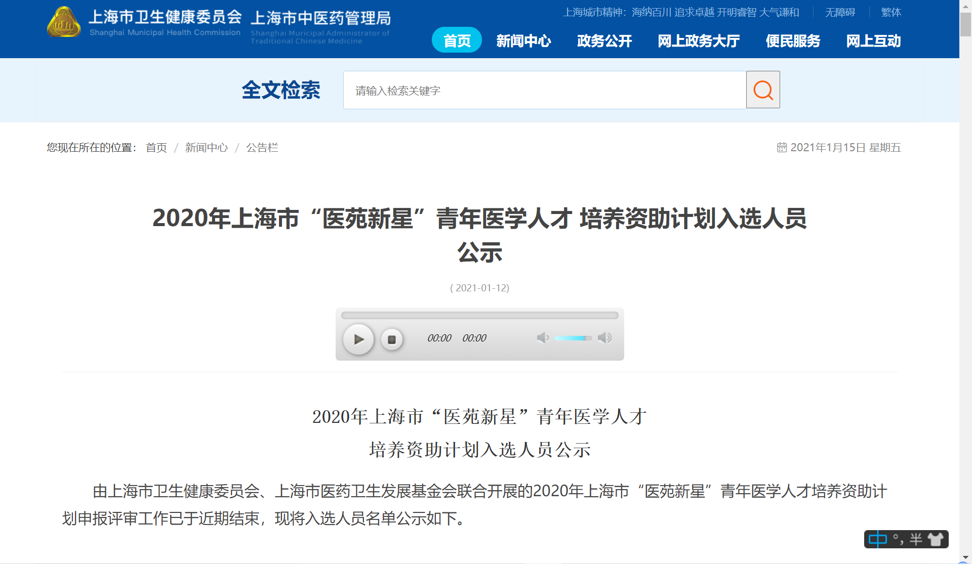 上海市“医苑新星”青年医学人才培养资助计划是上海市卫生健康委员会与上海市医药卫生发展基金会联合开展的资助计划,是上海市医疗卫生系统青年医务人员人才培养和公益服务的重要品牌,旨在帮助上海青年医学人才进一步完善和提高,在青年医务人员中有非常强的影响力。青年医师依托“医苑新星”资助计划,预期可为实施健康上海战略,把上海打造成亚洲医学中心城市做出积极的贡献。