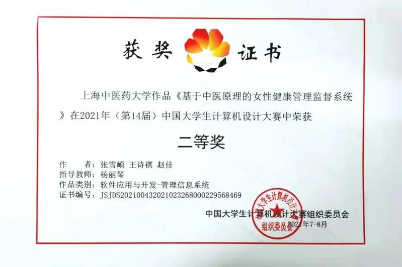 近日,在2021年(第14届)中国大学生计算机设计大赛软件应用与开发类比赛中,我院一组作品经过上海市大学生计算机设计大赛推选,与全国上百所高校参赛作品进行角逐,最终荣获全国二等奖。获奖的作品是由我校图书馆计算机综合教研室教师杨丽琴指导,我院2019级公共事业管理(卫生管理方向)班张雪頔、王诗祺、赵佳完成的管理信息系统作品《基于中医原理的女性健康管理监督系统》。这也是我院学生参赛以来获得的最好成绩之一。