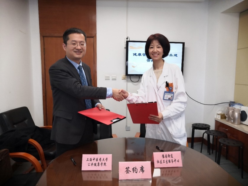 座谈结束后,我院院长赵海磊与豫园街道社区卫生服务中心主任张扬共同签署了合作协议书,并为“健康管理学科合作共建基地”揭牌。双方将发挥各自资源优势,共同开展健康管理服务,助力上海健康城市建设和医疗卫生事业发展。