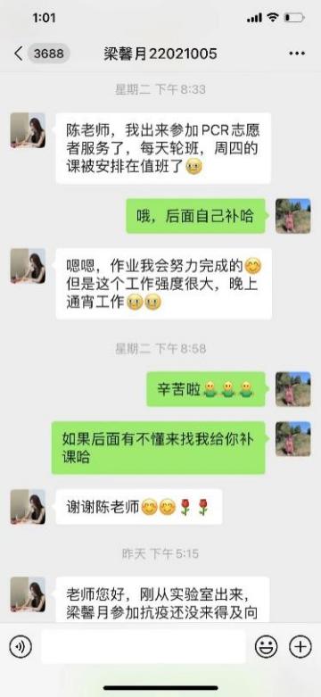 陈学芬老师在开展课程教学的同时,也关注到同学们因为疫情防控而出现的诸多特殊情况,并及时对这些同学个别关心。2019级公共事业管理班级赵江涛同学因发烧被单独隔离在学生公寓,陈老师嘱咐他保重身体,好好休养,不要担心学习进程,落下课程待康复后再补;在研究生班级中,周杰和李沐一等同学在医院和社区采集核酸近1月,梁鑫月等3位同学报名参加学校PCR志愿活动,陈老师第一时间表达敬意和关心,希望她们在工作时做好个人防护,等抗疫工作结束后为他们单独安排补课。陈老师日常还积极回复同学们在考研复试或写毕业论文中遇到的统计学问题,尽力做到有求必应,主动关心和爱护同学。陈老师说,学生在前线“守沪”,我们应该在后方为他们提供好学习保障。