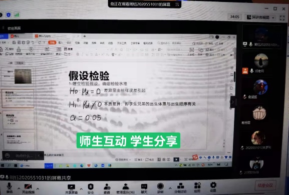为应对新冠病毒的迅速传播,学校自2022年3月13日下午15时开始封闭管理,并通知第二天周一即开展全面线上教学。流行病与卫生统计学教研室长期承担学校本科、研究生、国教学院以及继续教育学院的大量教学任务,面对突然转变的在线教学,教研室的老师们没有慌乱,即刻在原有的线下教学和线上课程的基础上,组织和设计好两周的线上教学和答疑安排,并通知到各个教学班级同学。在富有教学经验的老师们积极应对下,紧张的大范围的教学形式改变没有打乱原本的教学秩序,老师们从容地在线上平台开展教学活动,同学们有序地在直播课堂上学习,在课程中心中获取教学资料,通过教学软件完成作业和课堂小考,师生积极互动,教学效果与线下教学差别无几。