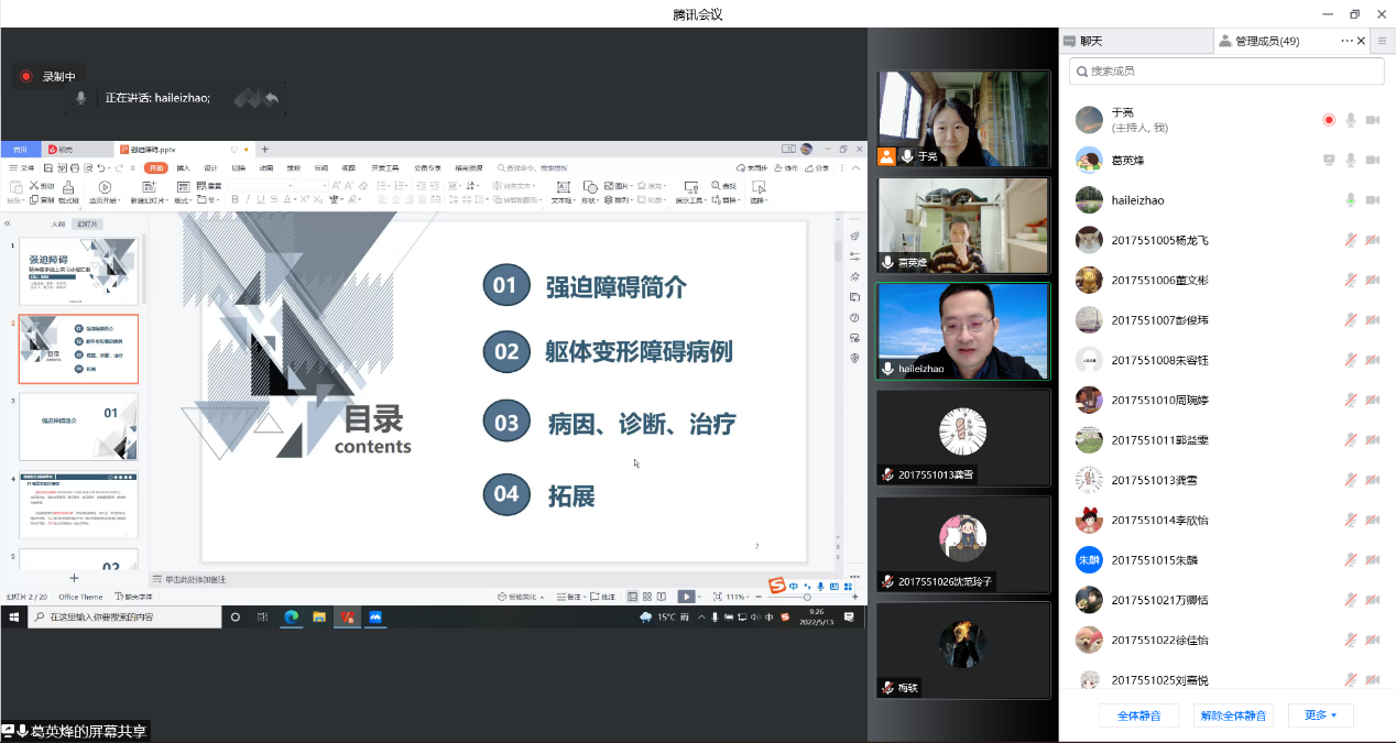 5月13日,ylzzcom永利总站线路检测精神病学线上实习汇报交流会顺利举办,预防医学专业学生分组开展汇报,围绕8个精神病典型案例,结合病案分析和文献研究,从不同侧重点对临床精神科疾病开展深入研究。实习汇报获评审专家肯定,展现我院预防医学专业学生严谨的学风和扎实的专业能力。ylzzcom永利总站线路检测院长赵海磊、预防医学教研室金如锋、全科医学系于亮以及2017级、2018级预防医学专业51学生参加汇报交流会。