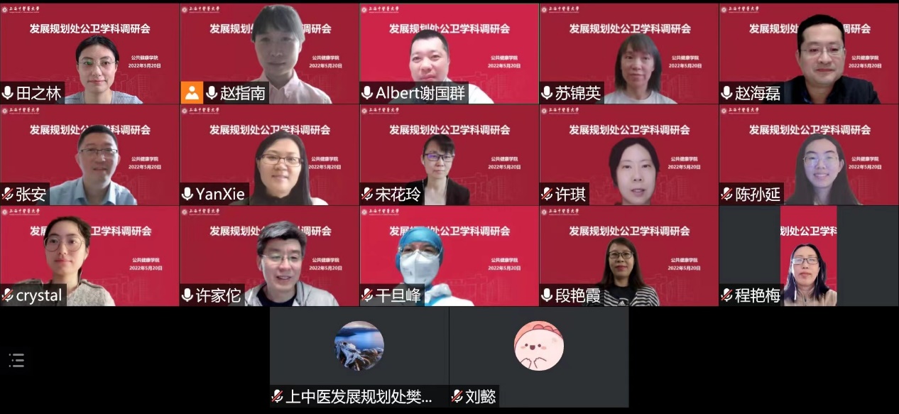 2022年5月20日上午,发展规划处许家佗处长、苏锦英副处长和全体老师与我院召开线上公共卫生学科调研会。我院段艳霞书记、赵海磊院长、干旦峰副书记、谢国群副院长及我院教研室、研究室负责人等参加了本次会议。会议由谢国群主持。