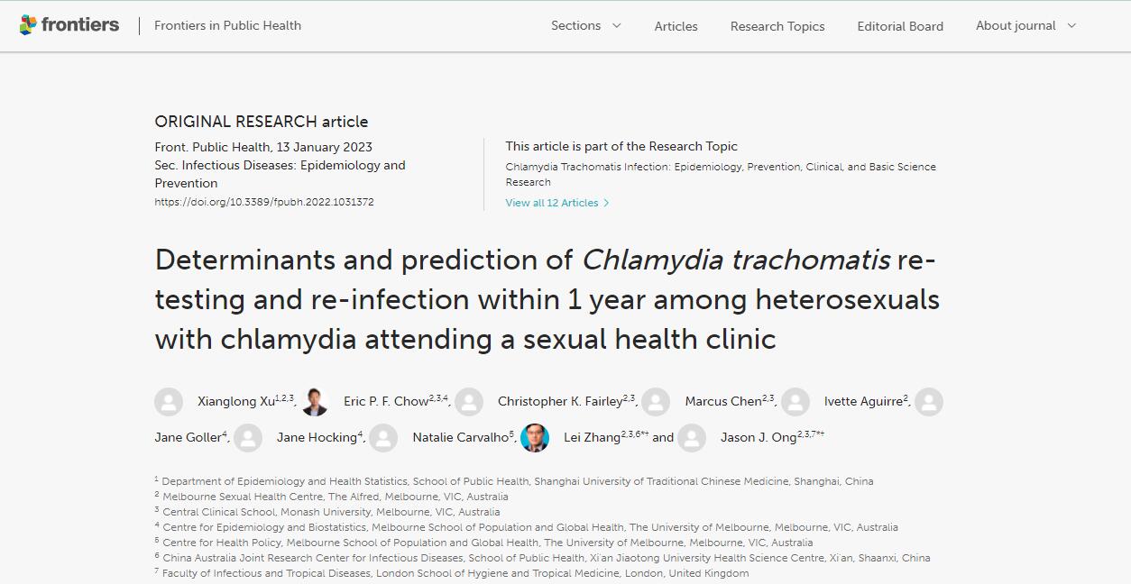 近日,我院徐祥龙特聘青年研究员和澳大利亚莫纳什大学Jason J. Ong, Lei Zhang, Christopher K. Fairley, Eric P.F. Chow等教授在Frontiers in Public Health期刊合作发表题为 “Determinants and prediction of Chlamydia trachomatis re-testing and re-infection within 1 year among heterosexuals with chlamydia attending a sexual health clinic” 的论文。该期刊主要聚焦于公共卫生领域的前沿研究。该期刊也是中国科协科学技术创新部发布的预防医学与卫生学高质量科技外文期刊,JCR分区为Q1,收录于SCI/SCIE, 影响因子为6.461