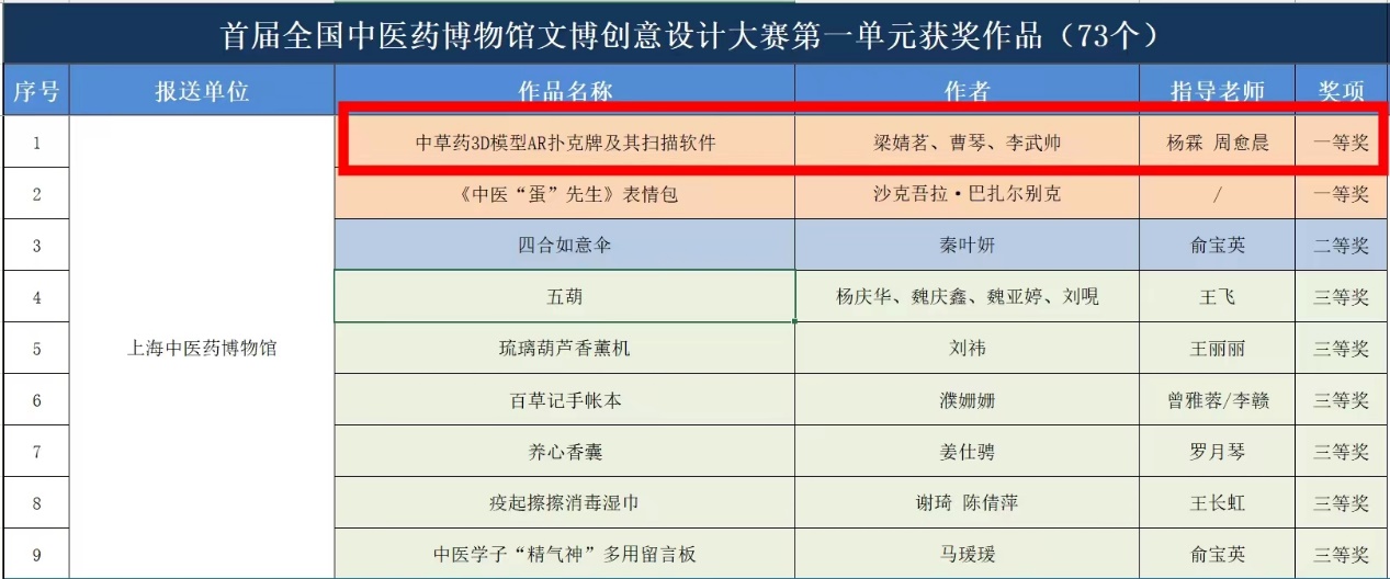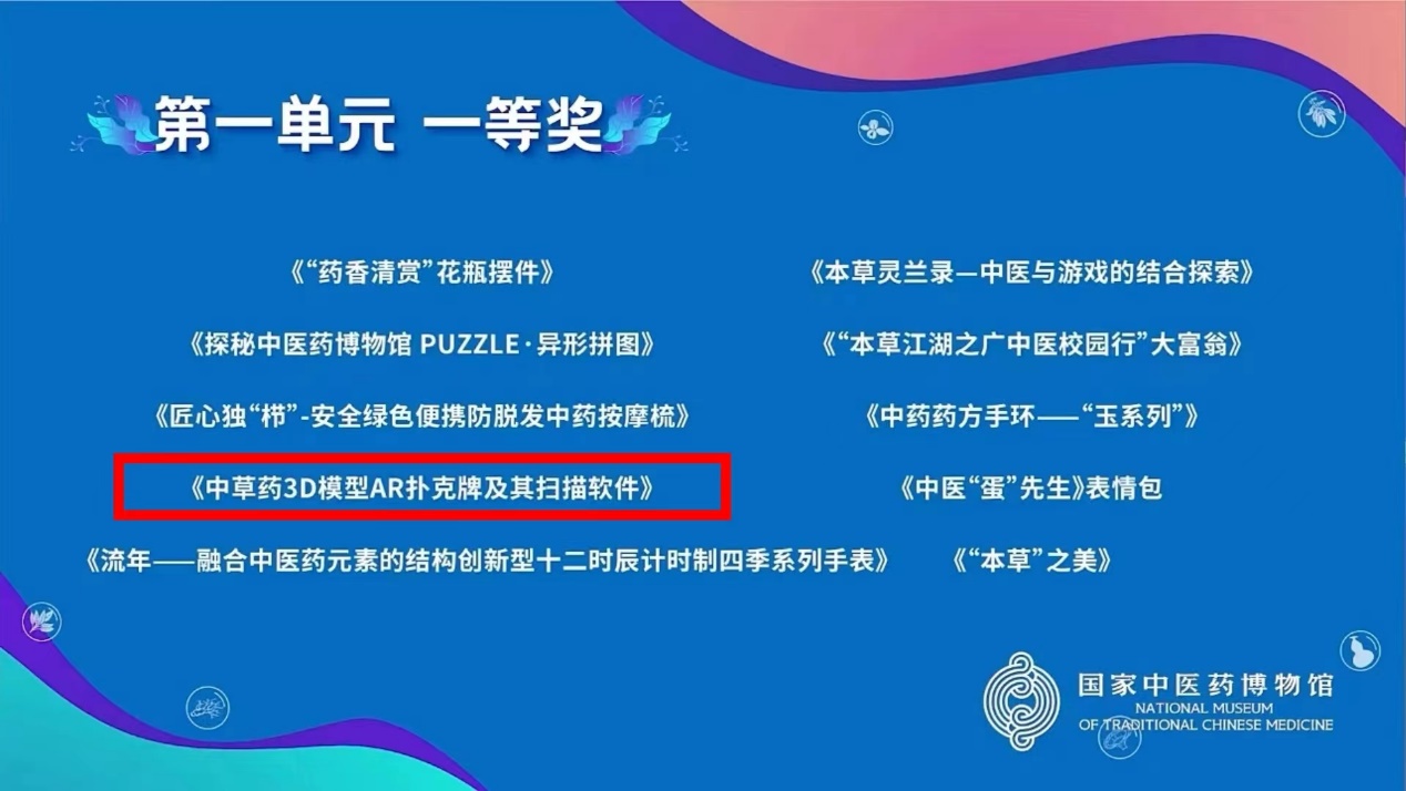 我院学生梁婧茗、曹琴的作品《中草药3D模型AR扑克牌及其扫描软件》在第一单元荣获全国一等奖;在第二单元多校合作团队创作中,由上海中医药博物馆张宇奇指导、我院梁婧茗、曹琴作为核心成员的道生队,作品《大师耀茶系列外包装》荣获冠军!