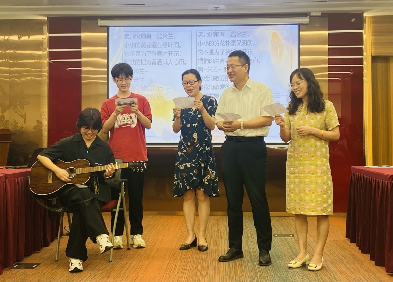 教师代表才艺展示环节将本次活动推向高潮,院长赵海磊、副书记干旦峰与汤晶晶、李倩、张翼三位老师共同献上一首上世纪八十年代、为赞颂教师培养人才呕心沥血、默默奉献精神的经典歌曲《我爱米兰》。