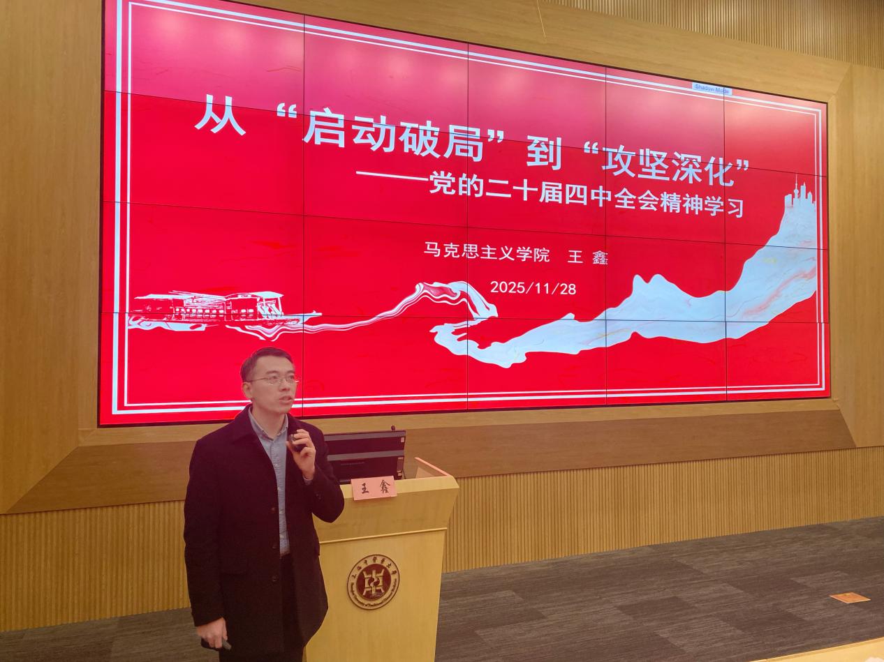 王鑫以“从‘启动破局’到‘攻坚深化’——党的二十届四中全会精神学习”为题,系统阐释了党的二十届四中全会的战略意义与实践要求。他指出,全会通过的“十五五”规划建议具有承前启后的重要意义,为我国中长期发展定向导航,标志着发展理念从“有没有”向“好不好”的深刻转变。通过对比“十四五”与“十五五”的战略定位,我国已从“被动应对”转向“主动塑造”,核心路径是办好自己的事,深刻理解“两个确立”的决定性意义,在复杂局势中保持战略清醒。